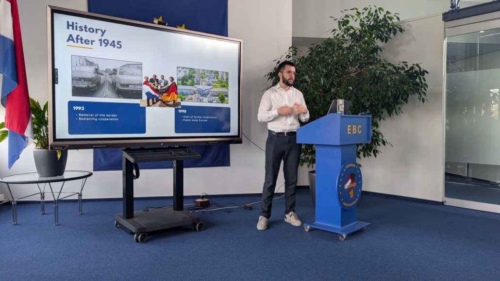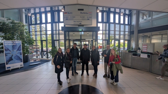 A tanulmányút második napja az Eurode Business Centerben kezdődött, amely épület közvetlenül a holland–német határon, Kerkrade és Herzogenrath között helyezkedik el, és a határon átnyúló gazdasági kapcsolatok támogatására szolgál. Sorush Brandenburg, Kerkrade önkormányzatának szakpolitikai tisztviselője kifejtette: az infrastruktúrán – így a közös kerékpárutakon és a kétnyelvű óvodákon – túl az Eurode-együttműködés egy egységes “tudásfolyosót” is létrehozott Aachen, Maastricht és Köln egyetemei között. A felmerülő gyakorlati akadályok szisztematikus felszámolásáért az AG Charlemagne munkacsoport felel, valamint az olyan szakosodott szolgáltatók, mint a munkaerőpiaci közvetítéssel foglalkozó Grensarbeid, vagy a Grensinfo, amely a határon átnyúló foglalkoztatás felmerülő problémáival (például komplex adó- és társadalombiztosítási ügyekkel) kapcsolatban nyújt tájékoztatást nyújt. Ez a helyi támogatási modell annyira sikeresnek bizonyult, hogy a kezdeti információs pont mára 15 Grenzinfopunkt (GIP) helyszínné bővült a holland–német határ mentén.