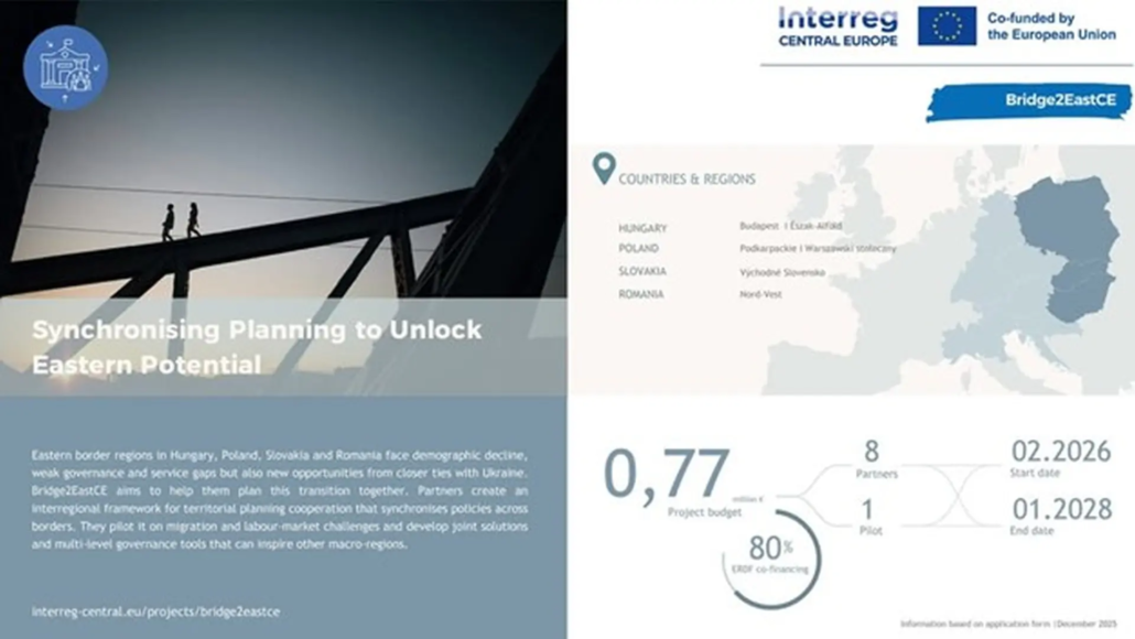 A konferencia ezen szekciója a Bridge2EastCE projekt tervezési szempontú ismertetésével zárult, amelyet Péti Márton, a Nemzetstratégiai Kutatóintézet elnökhelyettese tartott meg. Megszólalásában az EU keleti határtérségnek speciális adottságaira és az itt lejátszódó egyedi gazdasági folyamatokra hívta fel a figyelmet. Az eddig gazdasági és társadalmi kihívások jellemezte térség az utóbbi években felértékelődött, s már Lublin, Rzeszów és Kassa is jelentős gazdasági központtá váltak. Ezek a térségek egyfajta kapu szerepet töltenek be az unió és Ukrajna között, amelyből a helyi munkaerőpiac is hasznosul. A háború hatására Ukrajna nyugati része egyfajta logisztikai központtá vált, s a keleti munkaerő és vállalkozások nagy része ide helyeződött át. Ezen térbeli folyamatok szükségessé teszik a határtérség területi tervezésének az újragondolását, amit a Bridge2EastCE projekt is célul tűzött ki. A projekt keretében többek között felállításra kerül egy Interregionális Területi Tervezési Együttműködés, amelynek a tesztelése és véglegesítése is megtörténik. Mindemellett egy háttértanulmány elkészítése is a projekt tevékenységei között szerepel.
